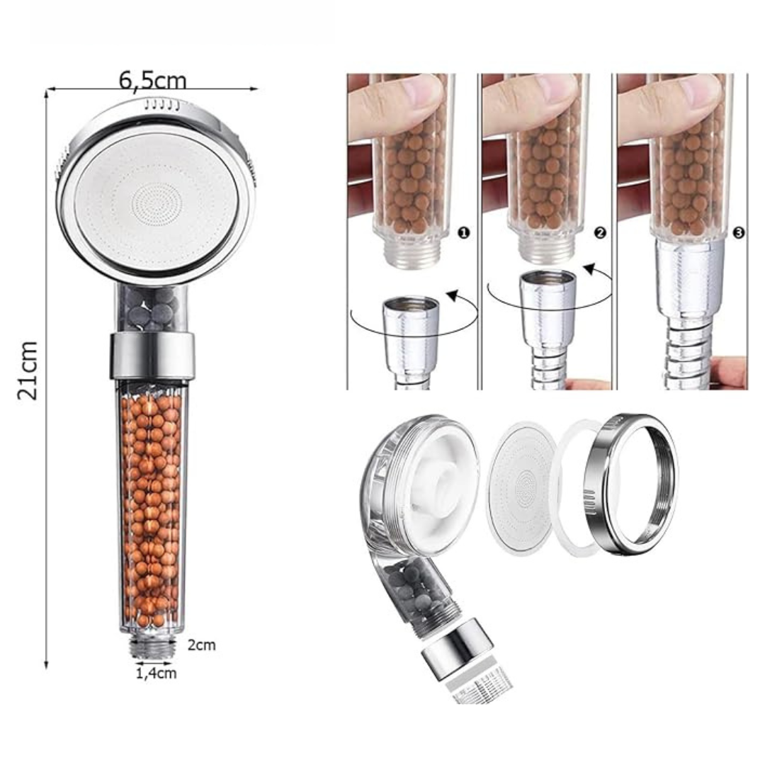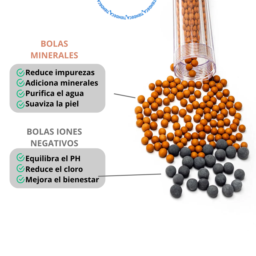 Las bolas de iones negativos que pueden neutralizar partículas cargadas positivamente, mejorando así la calidad del aire que se respira durante la ducha
