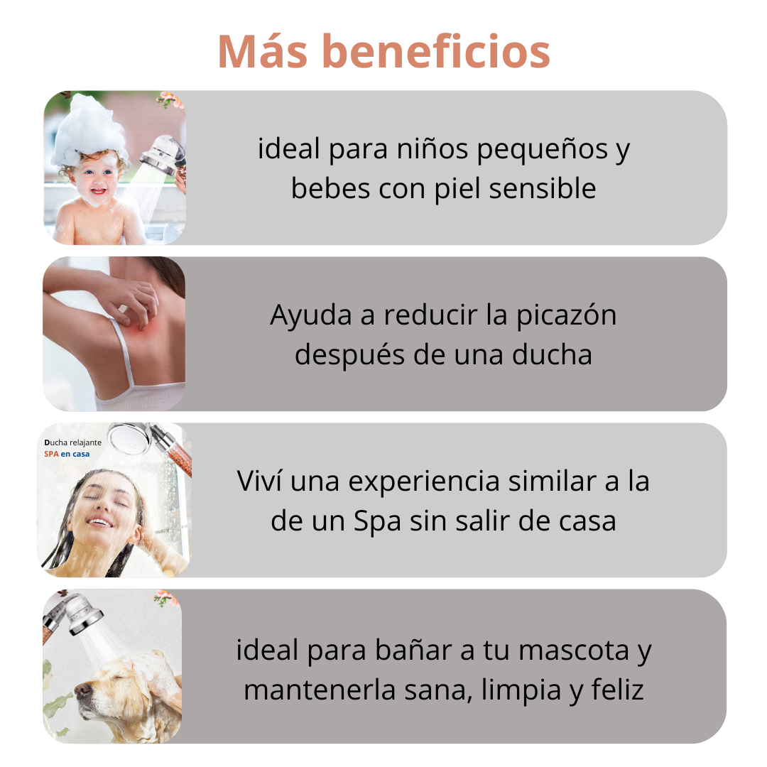 También al filtrar el cloro y otras sustancias químicas presentes en el agua, este duchador puede reducir las irritaciones en la piel y el cuero cabelludo, especialmente en personas con piel sensible o con condiciones como dermatitis o eczema.